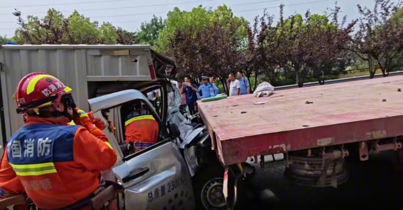 消防救援人员到场后发现,现场为一辆货车追尾一辆平板半挂车,货车车头凹陷半挂车车尾,挡风玻璃碎裂,驾驶位车门严重变形。货车驾驶员受方向盘挤压,无法动弹,时不时发出痛苦的呻吟,情况紧急。