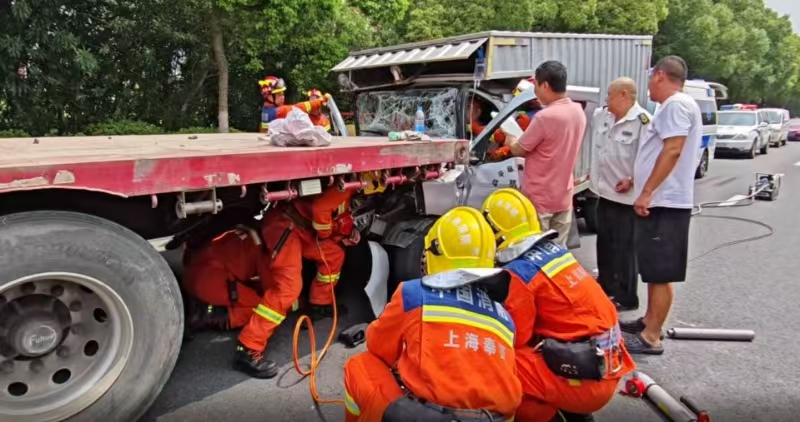 “师傅,坚持住!不要睡!” 救援期间,被困驾驶员意识模糊,现场的救援人员和医护人员密切配合,不断进行安抚,并采取相应救助措施。在成功将货车与半挂车分离,并获得一定救援空间后,救援人员随即使用液压撑杆对驾驶室进行扩张,最终在最短的时间内成功将被困驾驶员从驾驶室中救出,及时交付给现场的医护人员送往医院救治。